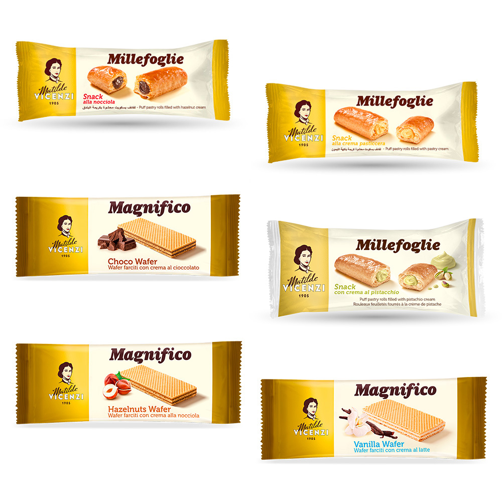 La línea Matilde Vicenzi Vending está diseñada para satisfacer las necesidades del sector de la distribución automática, ofreciendo productos de alta calidad como Wafers y Snacks en formatos prácticos y compactos.